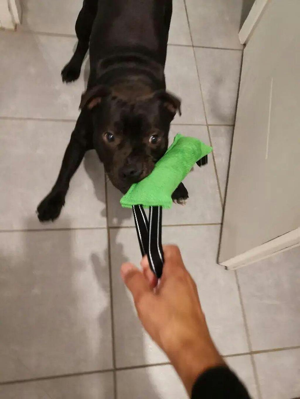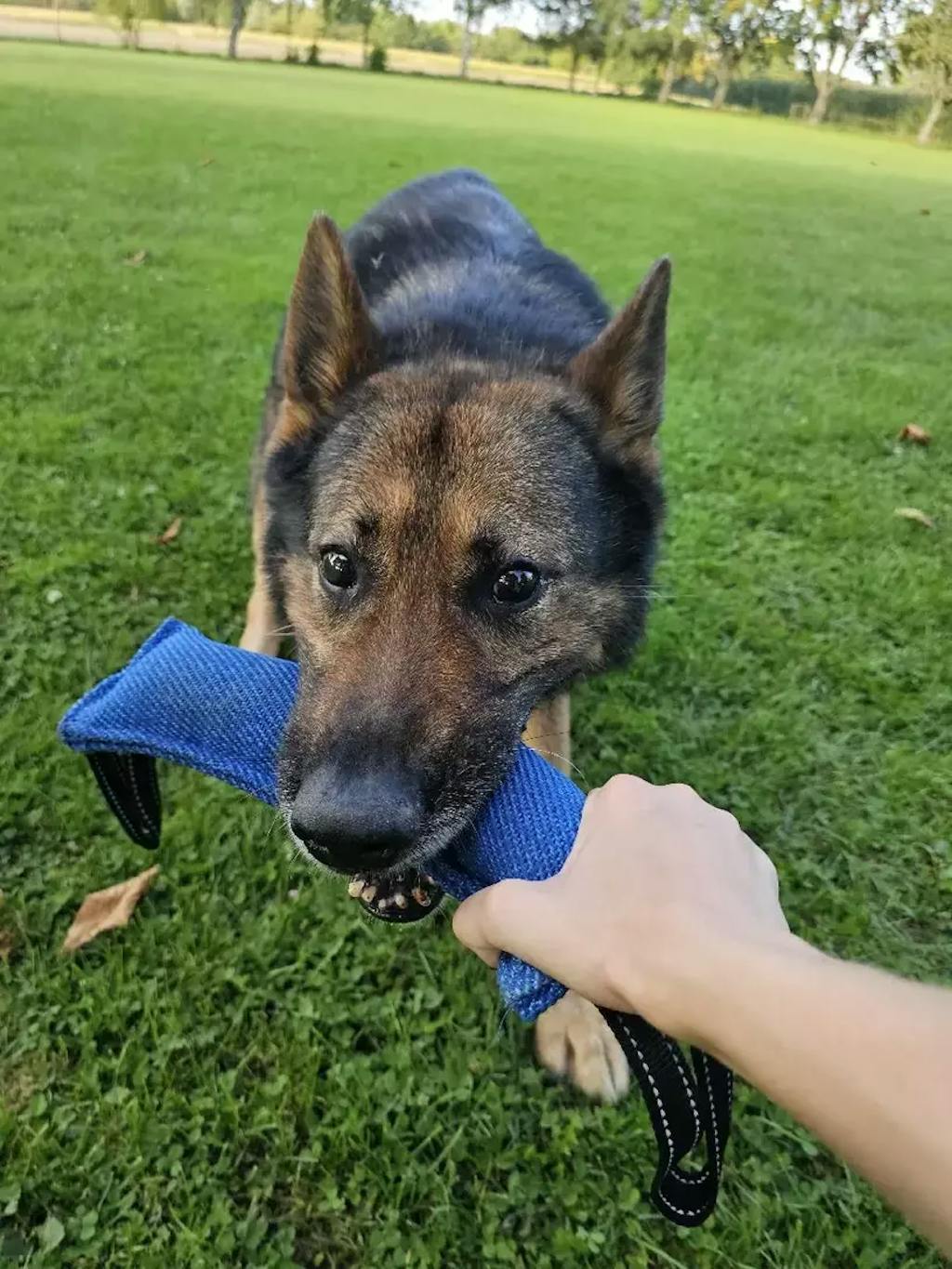 Ta igrača je res super! Z mojim nemškim ovčarjem trenirava obrambo in ta “bite stick” je odlična zadeva za trening. Ko ga enkrat prime, ga noče več spustit in bi ga najraje cel dan nosil naokrog. Zelo trpežen, točno tak, kot je na slikah, mere pa tudi štimajo. Definitivno bi jo kupila še enkrat.