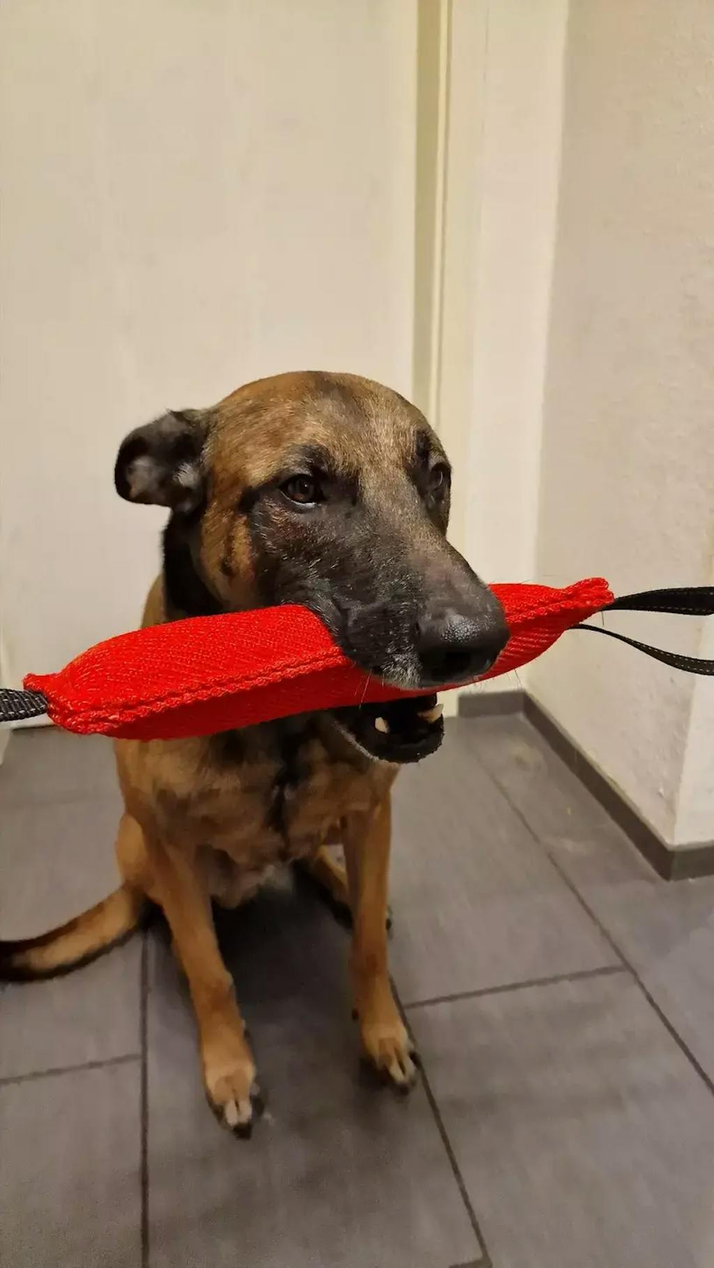 Moja Luna, belgijska ovčarka, obožuje to vlečko! Rdečo sem izbrala zaradi vidnosti, tako da jo hitro najdeva tudi na travniku. Igrača je izjemno vzdržljiva – Luna ima kar močan ugriz, ampak vlečka še vedno izgleda kot nova.